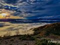Deze foto, genomen in de regio Marche, Italië, biedt een adembenemend uitzicht over een zee van wolken die de vallei bedekken. De zon breekt door het wolkendek aan de horizon en werpt warme, gouden tinten op de hemel. In de voorgrond zorgen ruige begroeiing en glooiende heuvels voor een natuurlijk kader. Een majestueus tafereel.