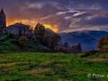 Deze foto toont een idyllisch landschap in de regio Marche, Italië. Op een heuvel prijkt een kerk met een slanke toren, omringd door herfstbomen in warme tinten. Het groene veld op de voorgrond contrasteert prachtig met de dramatische, met wolken gevulde hemel waarin een vurige zonsondergang doorbreekt. Een serene en tijdloze sfeer.
